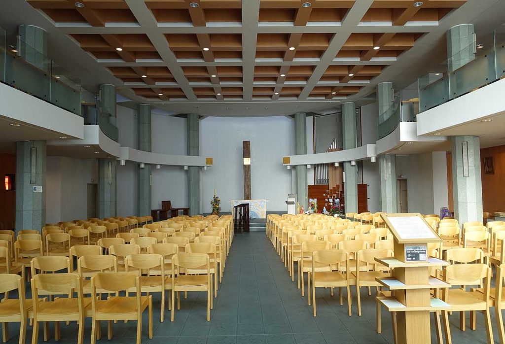 L’intérieur de l’église est dominé par le blanc et le gris clair, une teinte apaisante et aérienne. Sous l’imposante coupole, les vitraux diffusent un doux halo, plongeant instantanément les visiteurs dans une atmosphère sacrée.